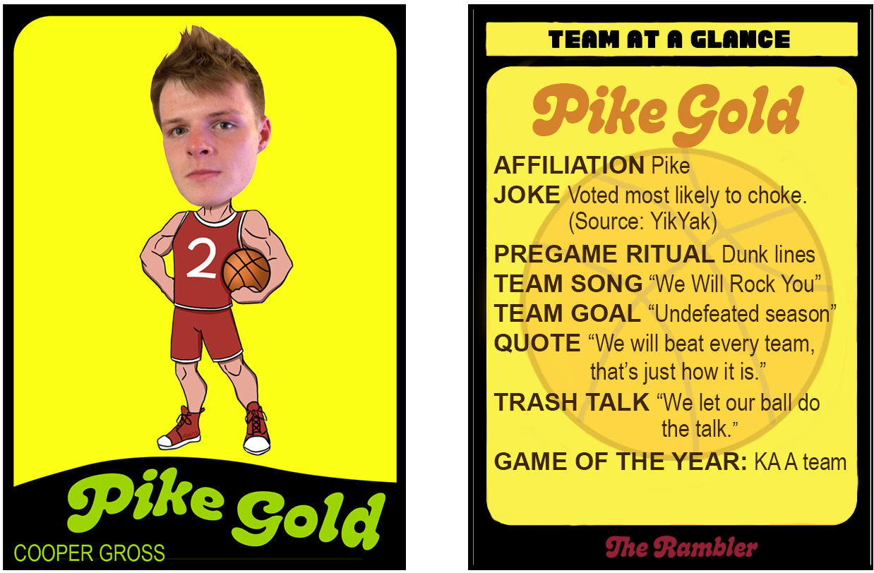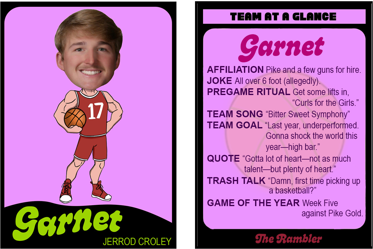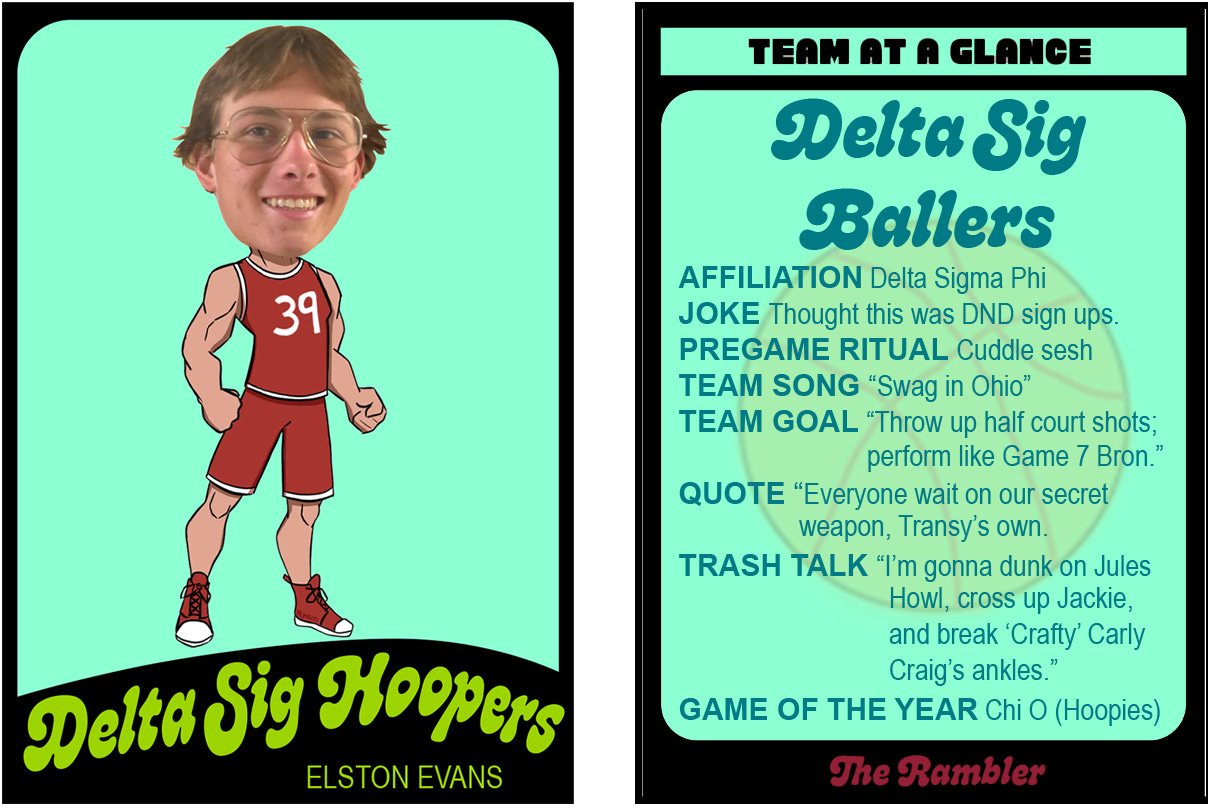 The boys from Sig battled in the A-League last year but decided their energy ran more to B this season after star John Buckle took his talents to Phi Tau A. How will the Chi Omega Hoopies—longtime B-League stalwarts—handle the new kids on the block? Already there has been some animosity between D SIG and CHI O. Standout D SIG sophomore Cash “Money” Doolin called out a few of the Hoopies starters by name (see card above for just how ruthless the trash talk is getting).